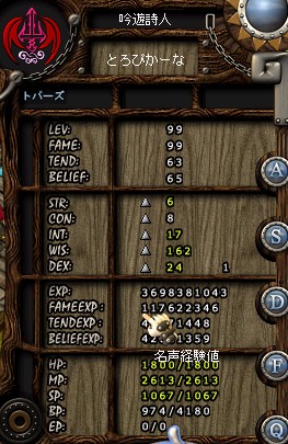 平日に更新するなんて珍しいでしょ? 実は有給休暇だったのです。 決算も第1ステップが終わり、あとは申告書の提出と株主総会までダッシュダッシュです。 有給だったならなんかやってたんだろうな! と思う人もいるかもしれませんが 一日中寝腐っておりました・・・。 やったことといえば、 スタッドレスタイヤを交換しに家の横のガソリンスタンドに車を持って行ったぐらい。 移動距離・・・100mにも満たず・・・。 こんなダメ男になったのも、明日は有給だひゃっほーいと昨日年甲斐もなく夜更かしをしたせいです。 なんで夜更かしをしていたかといえばアスですよ、アス! 今日は賊の話題ではなく吟の話題です。 一時は吟のイメージしかなく、賊のイメージなんてないとさえ言われた私ですが 実は吟のSSって殆ど残っていない。 なんでかって・・・そりゃいつもテンパってそれどころじゃないから。。 このSS、名前をAS2010022823235900という。 つまり撮影日は2010.02.28。 もう2年以上前から97だの98だのをやっていたのだ。 賊みたいに105にしたい! とかいうのもなく、地上専用とさえ考えていたけど ディムライトハープを貰ったし、目標にしてみようかと最近は鏡の城にちょくちょく行っていました。 激しい! まさに戦場だ! 湧き数がハンパないからとにかく指が攣りそうになる! かつてのデルクで動いていた吟さん達の気持ちが少しはわかった気がした! でも、ストーリーはよく分からんが、この記憶を失った冒険者達の中に今は去ったかつての知り合いがいたら・・・。 そんな風に考えると少し切なくなるね、なるよね! この過疎が進んだ中でこういうコンセプトを実装してくるか・・・。 最近どうも死に癖が付いたようで、ちょっとの事ですぐに死ぬカス吟になってしまいました。 99を目前に何度も死んで、一緒に遊んでくれた人には申し訳ない! それはともかく、墓の右下を見てください。 どうやら記憶を失っても金にがめついやつはいるようで・・・。 拾えるようになるまで居座るつもりなのか? と思うぐらいピクリともこの位置から動きませんでした。 ああ、今まで吟にはまともな装備を買ってあげてなかったけど、ソロソロ揃えたくなってきた! 無類のタフネスが欲しい!! そんなこんなでついに! やっと99になれたぜ! 協力してくれた人ホントさんくす! で、この後クエストこなして102になったんですけど・・・その時のステ振りがまずかったかもしれないと超後悔 ほら、100↑って一度に2つ振ることが出来るじゃないですか。 Wis2つ振っても意味ないよな! とかあのときは寝ぼけながらもキリッっと閃いたわけです。 CONより低いINTをなんとかしたい! ということでWISとINT1つずつ振ってたんです。 まずかったかなぁ・・・。 こりゃもうこの先INTでいいのかな。 吟の先輩教えてくれ! 今まで散々お世話になりました、オーラリラ・・・。 これからはゆとり世代の仲間入りだ!! でも・・・正直戸惑ってます。 体の慣れというのは恐ろしいもので いくらディムライトハープでギタースキルも使えると頭では分かっていても、いざスローをしようとすると どうしてもインベを開いてギターを探してしまうのです。。 カス吟の奮闘はこれからも続きそうです・・・。