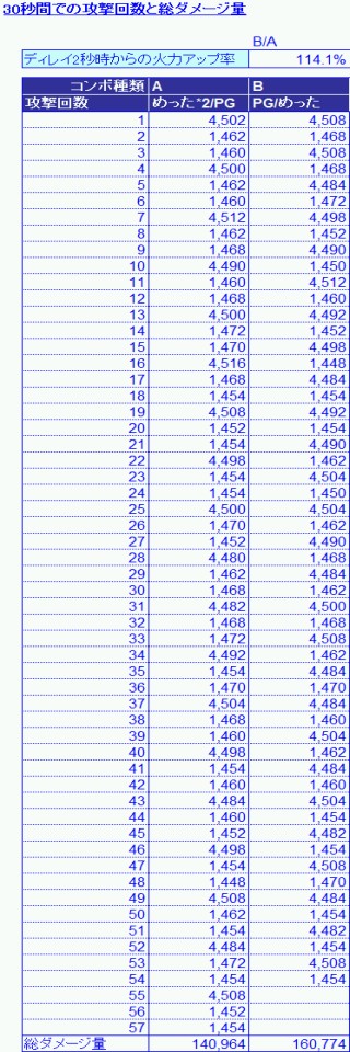 臥薪嘗胆にずっとファントムグラインドの修正を待っていました管理人です。 諦めなければ願いは叶う! まさに小説ばりの奇跡が起きました。 12/14のアップデート情報日頃は『アスガルド』をご愛顧いただき、誠にあ(以下略・ファントムグラインドのディレイ時間(1.5秒)が2秒となっていたため修正 キタ━━━━━━(゚∀゚)━━━━━━ッ!!!!! けど、なんかこの文言にすごいカチンと来たのは私だけでしょうか 盗賊がこの2ヶ月間、どんな想いでいたのか分かっているのか? 神経を逆撫でる書き方だ。 まぁそんな事を言っても始まらない。 とりあえず上方修正されたのだから内容を見てみると ファントムグラインドとめった刺しでの交互攻撃が可能になっています。 おお、これは大いなる進歩だ。 じゃあどのくらい攻撃力が上がるのか見てみよう 前提条件は以下の通り。 おいこら! しょぼいとか言うな! 耳が戦耳じゃないのは阿が持ってるから。 ブルジョアでもないんで装備を2式も揃えるなんて贅沢はできません。 スキルもこの体たらく。 元鞭賊だからなんて言い訳は出来ませんね、はい。。 んーで、この条件で30秒間でどれだけカカシの正面に攻撃回数とダメージを叩き込めるかを測ってみた。 動画はここではあげられないんで結果だけ A:ファントム⇒めった⇒めった⇒ファントム・・・ B:ファントム⇒めった・・・ Aが修正前の一般的なコンボ、Bが修正後にメジャーとなるであろうコンボ 30秒間の間に Aは57回攻撃を入れられて、その総ダメージ量は140,964 Bは54回攻撃を入れられて、その総ダメージ量は160,774 攻撃回数が若干減ったけど、総火力では15%弱もアップ。 おお、ファントム効果すげえ (´-ω-`)う~ん でも、ホントにファントムめったでしかできないのだろうか? もっと火力をあげられる方法はないものだろうか? 火力を上げるとなると攻撃回数を上げるかファントムが入る回数を増やすか・・・