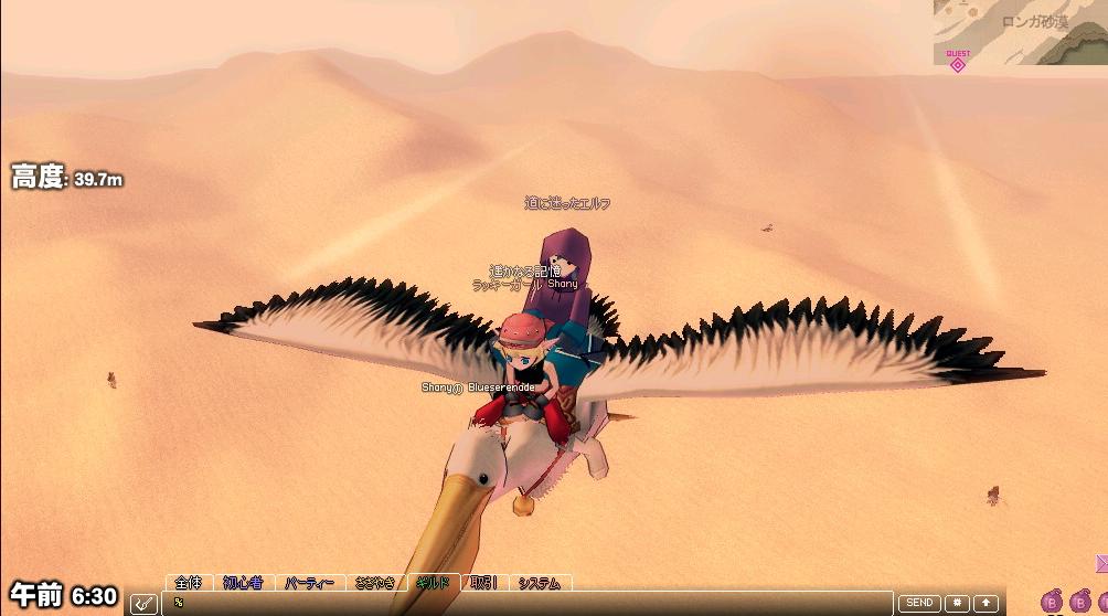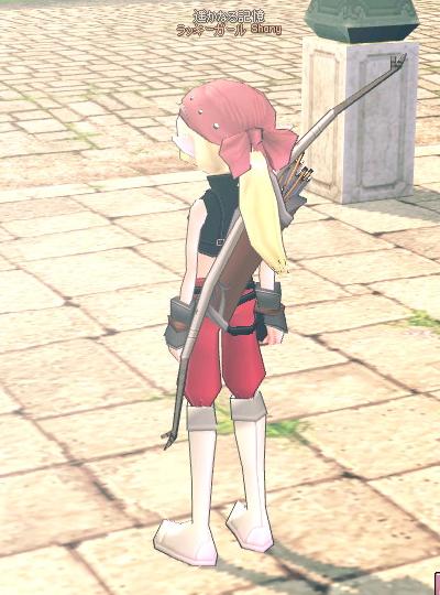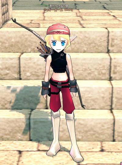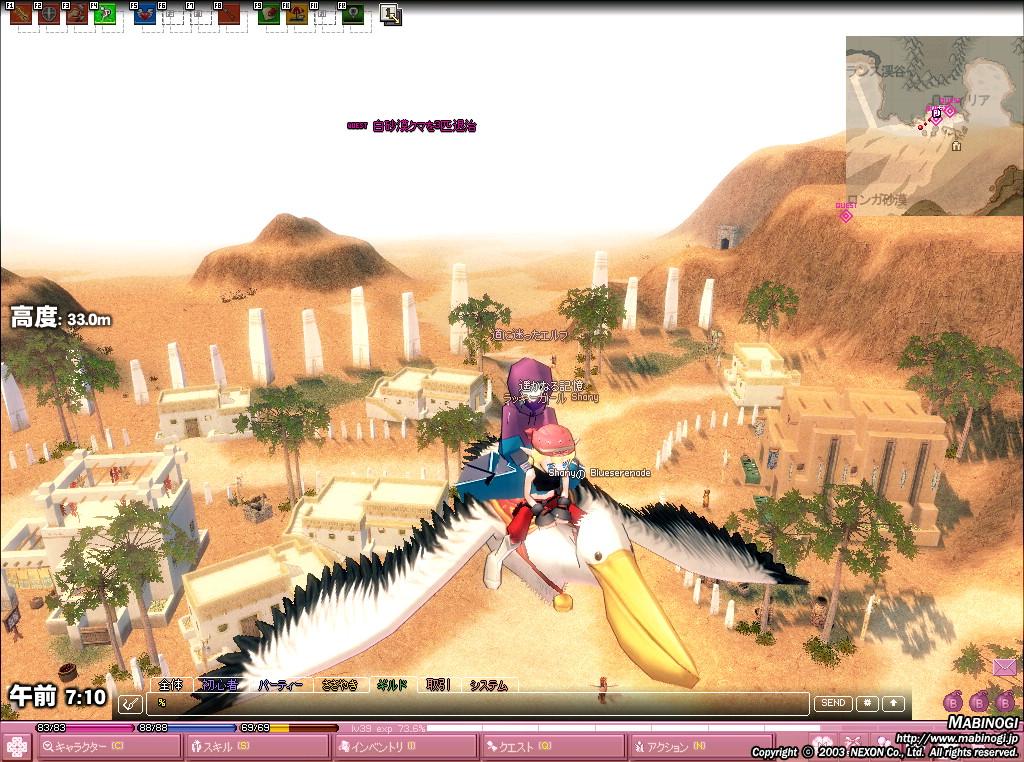 「あんたー! なんか通販でヘンなモノ買ったんじゃないの?!」 ギクッとして恐る恐る階段を下っていくと、母者の手には一通のダイレクトメールが・・・。 ところが、そのダイレクトメールの左端にある見慣れたロゴが目に入る。 あれ、ネクソンのマークじゃないか。 わ、わしなんか悪い事したかや・・・@@; 開封してみると、そこには一通の書面と何やら二つのビニール袋に入った・・・。 何とそれは、まーもらえるんなら応募でもしとくかーというぬるい動機で応募した 7周年記念リアルグッズプレゼント企画に当選した知らせだったのだ。 7周年ね・・・もう7年間もお世話になったんだなーとしばし感慨にふける・・・。 8周年は迎えられるのかな? 話は変わってマビの話。 エルフって足が速いからどこでも走っていけるんだけど、 やっぱまわりが馬に乗ったり鳥の背を借りて空を駆ってたらイイナーと思うわけです。 と、言うわけで買っちゃいました。 空を舞うというのはまた新たな感覚で、機敏に動き回るエルフとも、 地面を強く蹴って走り抜ける馬とも違う爽快さがあります。 下に見える人影が、いっそうにああ、飛んでるんだなーという感覚を引き立てます。 こういったところがやはり3Dゲームの醍醐味ともいえるのでしょうか。 走り抜けると結構時間のかかる町も、まるでジオラマのように小さく見えて あっという間に視界に現れては消えていってしまいます。 なんというか、きもちいいいいいいいいいいっ ってわけです。 今日は土曜日、キャラが1歳年を取る日。 大分攻撃ももらわなくなり、日に日に強くなっていくキャラが目に見えて成長する日。 いつごろ転生しようかとっても迷ってます。 慢性的にAP(アビリティポイント、スキルランクを上げる為に必要で、いわばキャラを成長させるために不可欠なもの) 不足に陥っている中で早くAPを獲得したいけど、どんな風に成長していくのかも見てみたいんだよナー。