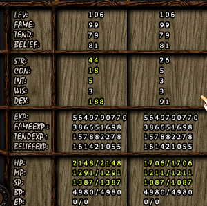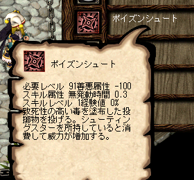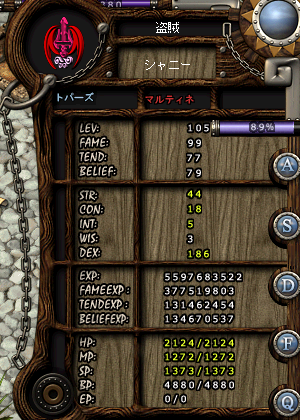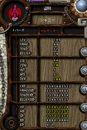 色々なスキルを駆使して頭使いながらソロできるって飽きなくていい。 でもね、一つだけ不満があったんだよ・・・。 どれだけ善悪が高くなろうと、どんだけ最大値が増えようとも 決して減ることのない青紫色のバー・・・。 魔に分けてあげたいぐらいだったのに。。。、 先日、ついに出たんですよ、待望の天上スキル! その名も・・・ ポイズンシュート☆ 実際に☆を所持していると威力が上がるという。 これ、ほかの毒全てと重なるという恐ろしいスキルの上、毒防御が通用しないという鬼畜性能。 こりゃすげーと思ったけど、狩場で実際使うと当たらない当たらない。 ということで、少し調べてみた。 DEXを100から200の間で変化させたときのダメージ推移。 DEXの値に対する比例計算のようだが、どうやらDEX200-ダメージ1,000で上限のようだ。 DEX賊にとってもかなりムダが発生することになる。 じゃあ当たらない当たらないとお嘆きの方も多い命中率のWISとの関係 どーよ、こんな盗賊見たことないでしょう! でも、これだけWISがあると魔法なんかまるで当たらない。 対人する人は盗賊相手にしなければそこそこ面白い組み合わせではないでしょうか・・・。 ぼくは対人しないから知らないけどさ!結局ラストマインドとか喰らったらイノストで吹き飛ぶんだけどさ! で、本題からそれたけどWISを3から70まで変化させた時の命中率推移 1回の試行(10回スキル使用)のうち何回ヒットしたかを表している。 見てもらえば分かるように、やはり命中はWISに依存するところがあるようだ。 でも、ここまで賊としての本分を犠牲にしてまでようやく70%といったところ・・・。 これは・・・どうなんだろうねえ。 おまけ、もう少しでテトラだー 71服の形にするんだヨー それが終ったらやることなくなるなぁ。 そーだ善悪変換して善の道に再び舞い戻ろう、そうしよう。 1億8,000万も飛ばすのは勿体無いって? 賊LOVEにとってみれば賊を動かす動機が出来る、ただそれだけのコトなのさ! PR