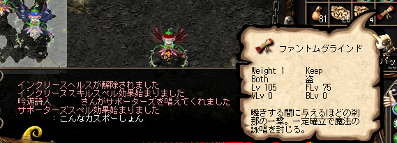 もう大分ファントムグラインドを求めてティルオで狩をしてるけど・・・ こういうぬるいドロップばかりが続いて運をそぎ落としていく。。。 ままあるよね。 レアなんだけど資産価値としては微妙っていうの。 やばいっすおう。 1月6日にもう少しで105だあと書いていますが・・・ 今、レベルが1上がった状態でまた同じ状況になろうとしている。 ファントムが無いまま106だと・・・。 悲しいのう悲しいのう;;;;;;;;;;; と、いうわけで、ぼくはある秘策に出たんだ。 切り札というものは最後まで取っておくものだよ、ルパン君!! そう、アイテムボーナス[4]だ! 90分の間、アイテムゲット率を15%増やしてくれる優れモノ。 どうやらハンティングチャレンジやペットとは重ならないようなのだが・・・。 ん? 画像が違う? そんなもの、切ってしまった切り札の画像などあるはずなかろう! 似たイメージの画像を張ったんだぜ。 こまけえこたぁいいんだよ!(AA略 元々のドロップ率が渋いのに、効果あるわけねーだろ、と使用前からネガチブな一行。 そしたら・・・なにこの怪しい通信販売並みのビフォア/アフター まじでキタ━━━━━━(゚∀゚)━━━━━━ッ!!!!! 苦節云々、ようやく出たわけですよ! ぼくに出たんじゃないんですが、それでもすげー。 ファントムグラインドにピンポイントってところもまた事実は小説より奇なりというか。 ところがところが、驚きは際限を知らず・・・。 ∑(゚∀゚*)エェ?! 今までうんともすんとも言わなかったシャドーファントムのアニキが! いつもいつもマジぱねえっすっと泣かされ続けてきたアニキが・・・ 今日は輝いて・・・見えるぜ・・・。 アイテムボーナスの力、恐るべし。 欠点は前述のとおりハンチャレやペットと重ならないことに加え、アイテムボーナスを使った対象が モンスに止めを刺さなければ意味が無いというところ。 実際、ファントムグラインドもブースとモラルも、使用者が止めを刺していたようです。 切り札TUEEEEEEEEEE さて・・・ファントムグラインドがようやく目の前に。 あぁっ、この力は・・・この暖かさは・・・などとどっかの放浪詩人の台詞が頭をよぎりましたが・・・ オレは手札のブーストモラルを生贄に、ミラクルサモンを召還する!!!11 吟の105スペルはガーディアンを召還する魔法。 最大3体まで同時召還でき、預言者のタロスよりも遥かにタフく、自然回復も尋常じゃない。 うまく使えばかなり屈強な壁として重宝できそうです。 ・・・ そして夢は覚めた・・・。 夢じゃないことを祈って次の日ログインしてみると・・・ あった・・・よかった・・・。 ちなみにファントムグラインドの購入に要した金額は 現金15億 + ティアレイドブーツ(25億相当)・・・。 まぁ一生もののスキルになるだろうし、これから少しずつ回収していくさ! まずはだな・・・すっからかんになったマナ棒代の工面からだな。 え? で、実際の使い勝手はどうだって? それはまた次回ということで。 昨日は感涙に浸ってまだ満足に使って実感して無いんだよう。