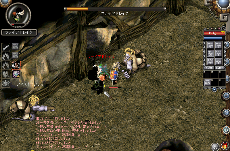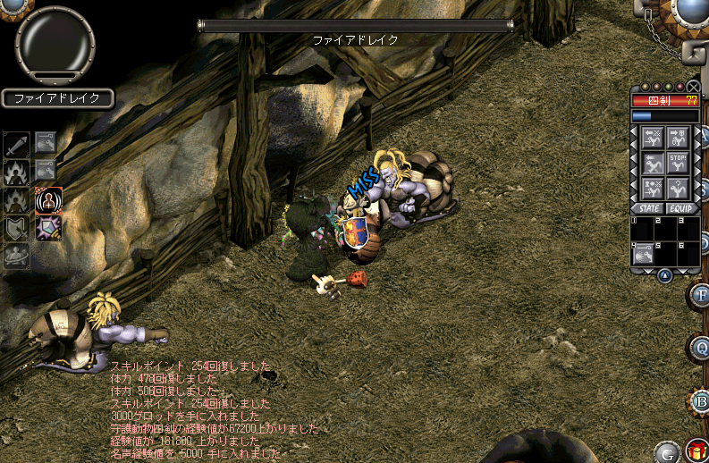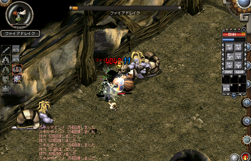 テストで阿修羅が凄まじい火力を見せていたなー。 ・・・そういや89の戦士でファイアドレイクを倒せるかな? 思い立ったら即行動。 マナ棒を積んでいざディグバンカー最下層へ。 場違いな場所で中級レベルを困らせるならず者。たまにはぎゃふんと言わせてやらないと。 相変わらずカタツムリファミリーは元気です。 しかしここまで沸いてると・・・きもい・・・。 それに移動しながら遠距離を撃ってくるようになってからは結構イタイ・・・。 10分ぐらい走り回ってようやく発見! どーでもいいときにはイヤと言うほど遭遇するのに! とりあえず殴れ殴れ! おっおっ キタ━━━━━━(゚∀゚)━━━━━━ッ!!!!! とりあえず89の戦士でも倒せるようです。自然回復ないしね。 でもおかしくね?こんだけタフいくせにもらえる経験値は普通のティラノと同じ(このときはHT)! おかしくねー?おかしくねー? なんか地下鉄で先頭に並んでたのに乗車が最後みたいな理不尽さを感じる!