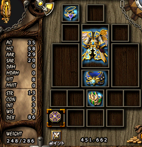 おかげで経常利益も黒字へ。問題は営業利益の黒字化ですけどね。 話はガラッと変わってアスの話。 7/1のアップデートで、ついについについに! 無制限のステータス再配分スクロールが販売されることになりました。 どれだけ多くのユーザーが、このスクロールの再販を望んでいたことでしょう。 3,000円はかなり値の張る一品ですが、プレイ時間単価で見れば! 何より、前からSTR賊の不器用さにはかなりイラッとしていたのでなんの躊躇もなく。 いつ振りでしょうね。もう再販はないと思ってたからありがたいもんです。 前の時は再振りを行うと若干HPが増えるといった副産物的効果もありましたが、果たして。 これが再振り前のステータス。超絶装備を持っているわけでもないので とてもじゃないけどこれでは賊らしい振る舞いは出来ない。 実際3次ではかなり不自由さを感じていた。 そしてこれがステ振り前のHP/MP/SP CON2振りだけど、善悪補正のおかげでまずまず。 噂ではステを振りなおすと善悪1~40も 41以降のアップ率である+6が反映されるらしい(通常は+5)。 でも、善悪決定時のステータス1ポイントも消えてしまうとか・・・? 早速やってみましょう!CON振りは前回と同じ2とした。 ステがリセットされ、どんどん振っていく。 お、善悪決定分もちゃんと加味されてる! あれ、でも善悪があるのにすげーHPが低い・・・。 と思ったら、再配分は終っても、再配分スクロールはまだ消えてはいない。 2重のバグかと思ってスクロールをもう一度ダブルクリックしてみると 今度は先ほどのステ再振りとは別に善悪のHP補正が始まったのだ! ごめんねネクソンさん。でも、日ごろ行いが悪いんだお! こんな感じに・・・だけどSSを取り忘れていたので これは3次解除服と3次解除脛、そしてエデルスピリットを装備した状態なので 素HP = 1,584 - 160 - 50 - 30 = 1,344 再振り前:1,363 再振り後:1,344 うおお、下がっておるう。 善悪40までの補正はきっちり+5で計算されている模様(6でアップ分が割り切れない) エデルクエストでもらえたカードのHP補正もついていないからのようだ。 ちょっとここはネクソンにメールしてみよう。 ちなみに再振りした後のステータス。やっぱこのぐらいでないとな! ウェイトがかなり下がった。