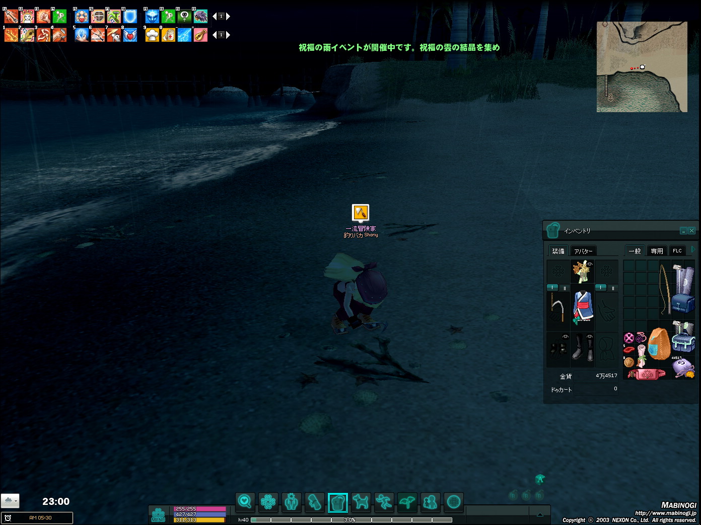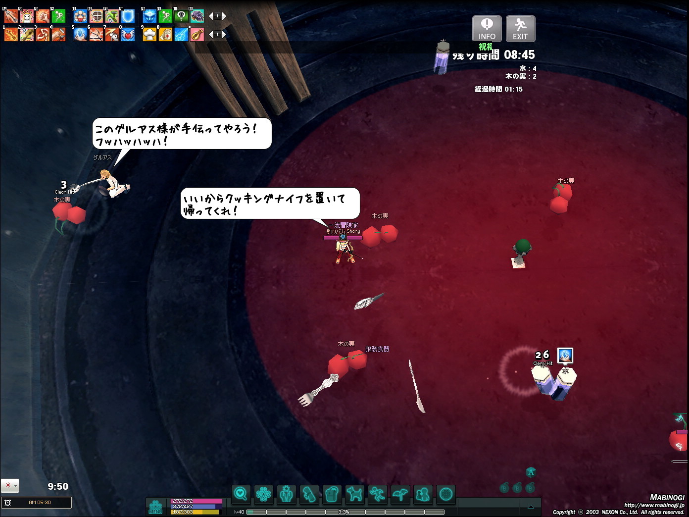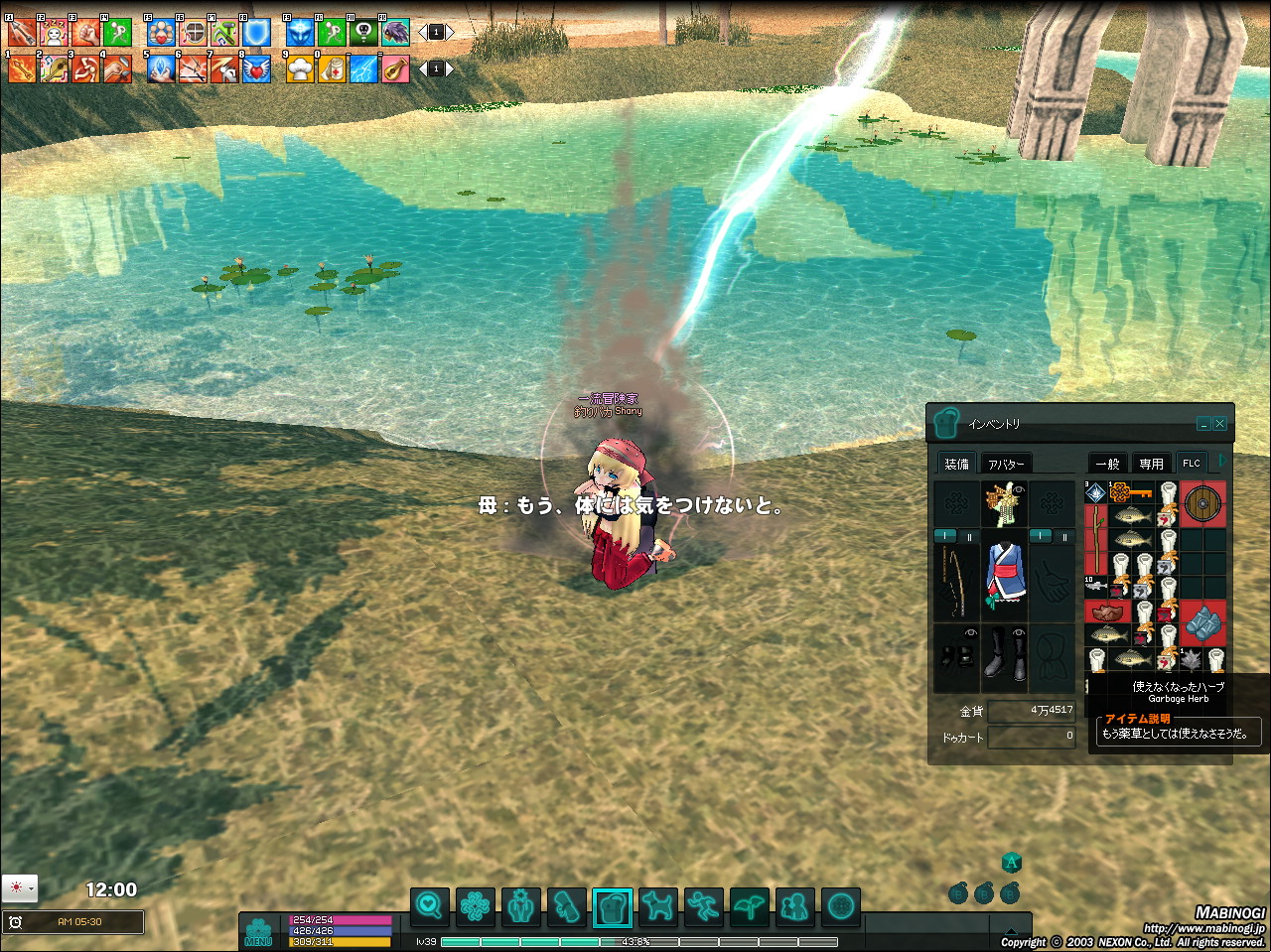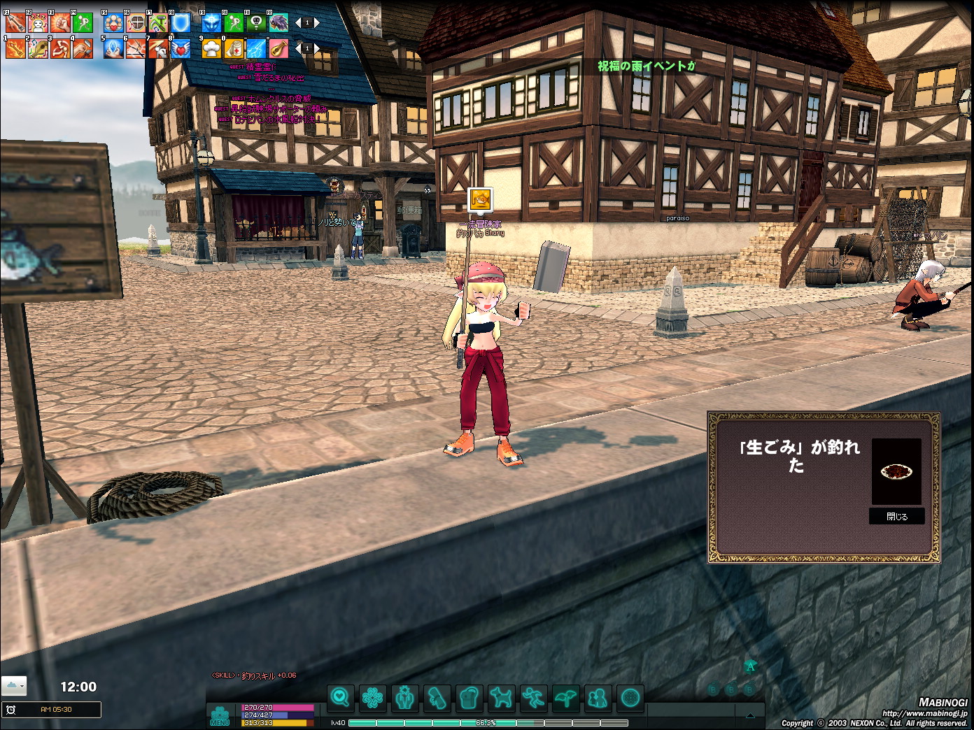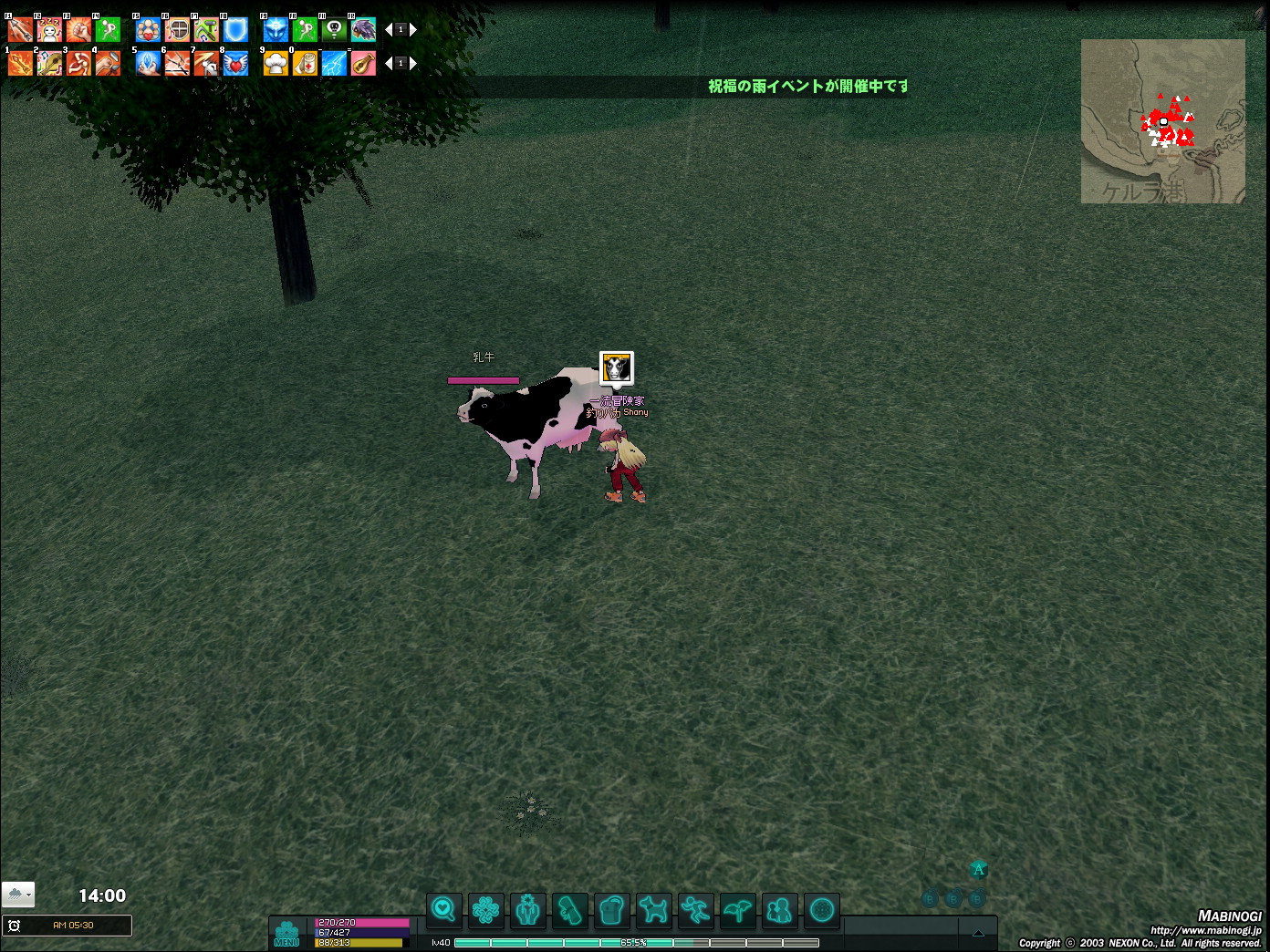 社蓄だろうと何だろうと毎日必ずやっている流れでござる。 まず最初にログインするのはアスガルドではありません・・・マビノギです。 ログインしてまずやることはゴミの整理です。 釣りしてぼけーっとしているのですが、そうすると釣り上げた魚やらその他色々でインベントリがパンパン! それを整理・・・というかポイ捨てするので周りは一気にジャンクフィールドと化します。 インベの整理が終わったら一路王都タラへ。 向かった先は影ミッション掲示板ではなく、タラ王城の料理室。 そう、毎日のマビノギの日課その一は料理ダンジョン。 フルーツジュースだけに狙いを絞って8週しています。 5分で経験値8万はうまいです。 ガチ戦闘構成の人なら一般的な影ミッションのほうが遥かに稼げるとは思いますが どっちかと言うと生産構成で戦闘スキルもやりたいものをテケトーに上げてる為弱いのです。 エルフの癖して弓は特級、近接がロイヤルと脳筋化してますし。。 ダメージソースはスマッシュとメロディショックという・・・これなんて人間? とはいえ、パーティヒーリングのために上げたマナと現行最高ランクのマナシールドのおかげで死ぬこともない。 とりあえずココを8週。 鍋の出入りとかも含めても50分程度で64万もの経験値。 費用はレシピ代の1,000×8と2日に1回削れる弓や楽器の修理費ぐらい。気楽でいいですなー。 料理ダンジョンが終わったらイリアの海岸へ。 そこで潮干狩りをして鍬さばきのスキルを鍛え・・・ 今度は畑に赴いてジャガイモ堀をして鍬さばきのスキルを上げています。 それも終わったら今度は・・・向こうにターゲットが! 今度は乳牛の元へ瓶を持って乳絞りを! 何をしてるかって言うと、これらは料理スキル関連なのです。 これらをすべてあげれば料理関係のタイトルを取得できる。 目指すはグランドマスター料理人! そこらのトレーニングも終わったら、鍬を釣竿に持ち替えて! 昨日は川釣りを楽しんだから海釣りだ! ・・・意気揚々とスローイングしたものの・・・ あらら、残念。 気を取り直してもう一度! 何釣って喜んでますねん! ゴミは棄ててよ!! ほのぼの系と言いながら、実は結構戦闘ゲーとなっているマビノギ。 最近ではマビノギは原点に戻るというコンセプトのClassicアップデートがありましたが こうやって採集やったり釣りやったり、ガツガツやらずにゆったりやるのもいいもんです。 ゆったりと平凡に日課をこなし、今日出来なかった分はまた来る明日にがんばろう・・・今も釣りしてます。 ここまで来たらマビノギは裏にまわり、アスガルドにインします。 結構時間かかってるように見えますが、料理ダンジョンで1時間、鍬裁き20分、乳絞り10分で1.5時間です。 マビでもアスでも吟遊詩人。 どーもどの世界でも前衛でガンガン進むのは向いてないようですなぁ。 だらーっとほげーっと、まぁ今日もテケトーにがんばりますか・・・。 今日は文字多かったでしょ?